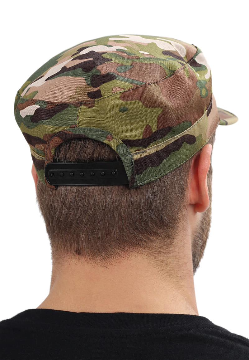 Кепка с камуфляжным принтом предназначена для туризма и отдыха, а так же позволяет маскироваться на фоне пейзажа. Широкий жесткий козырек защищает от различных климатических условий. Объем регулируется с помощью пластиковой пряжки в затылочной части.