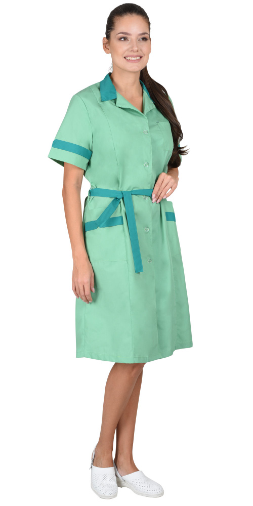Халат женский укороченный, полуприлегающего силуэта, с центральной застежкой на пуговицы, с рельефными швами, с одним верхним и двумя нижними накладными карманами, воротник отложной. По талии в шлевках продет пояс.