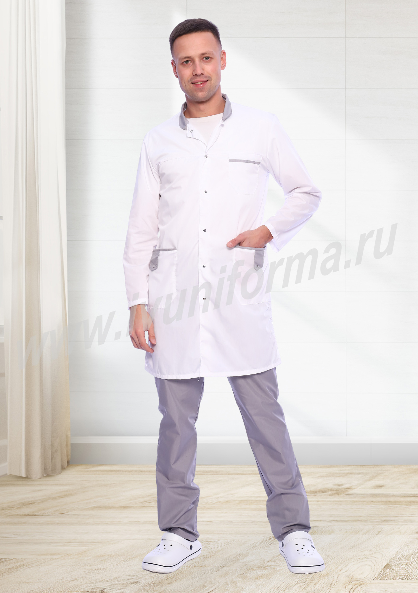 Халат медицинский мужской "Флойд" белый с серым