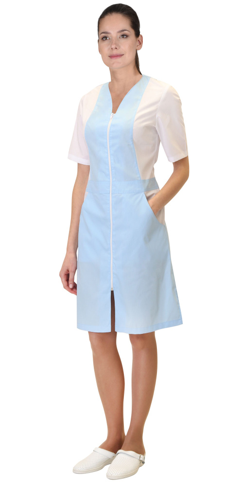 Халат женский полуприлегающего силуэта из ткани голубого цвета с белой отделкой. Центральная застежка на тесьму "молния", фигурный V-образный вырез, настроченный пояс, два нижних внутренних боковых кармана с овальным входом. Рукава втачные, короткие.