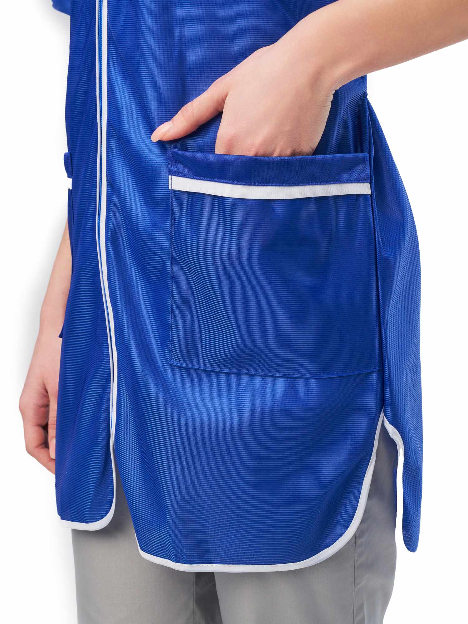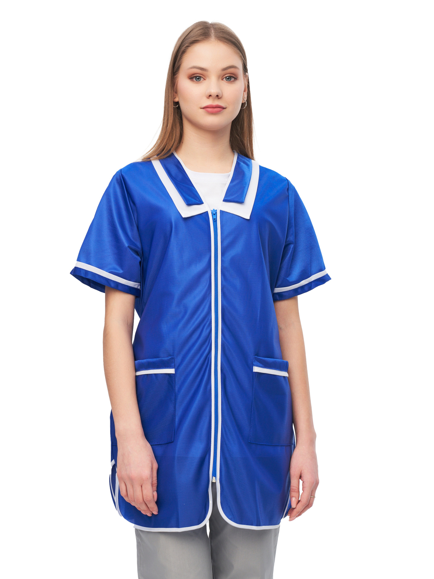 Халат с декоративным воротником, с большим функциональным карманом, разделенным на две части. Рекомендуется для работниц сферы обслуживания, технического персонала гостиниц, для работников торговли.