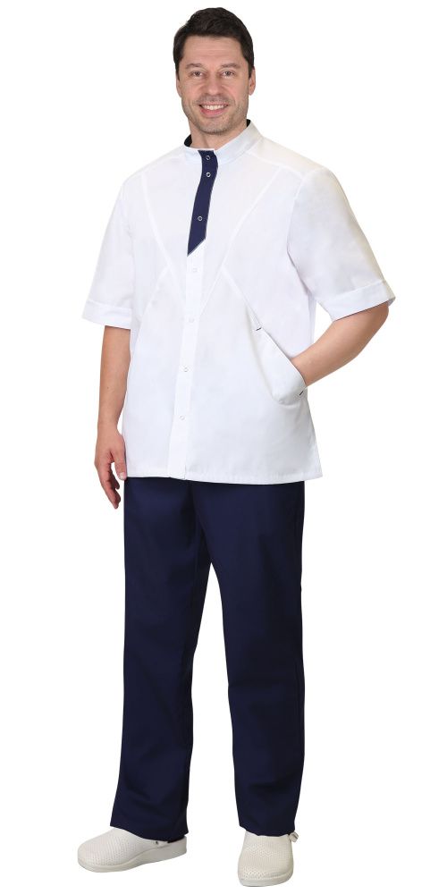 Костюм мужской комбинированный из ткани двух цветов, состоит из куртки белого цвета и брюк темно-синего цвета.