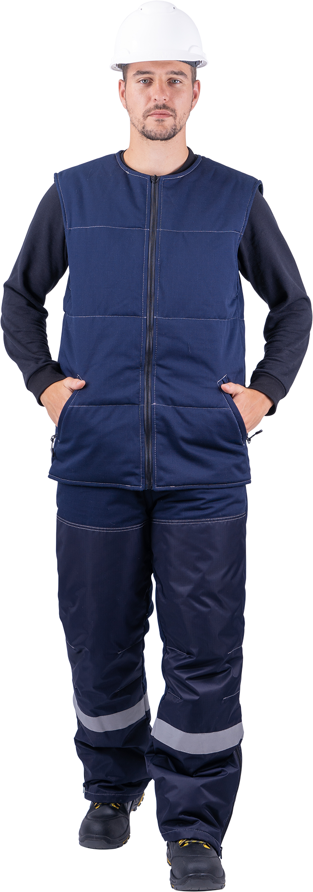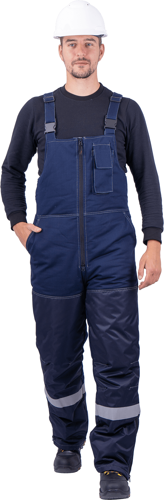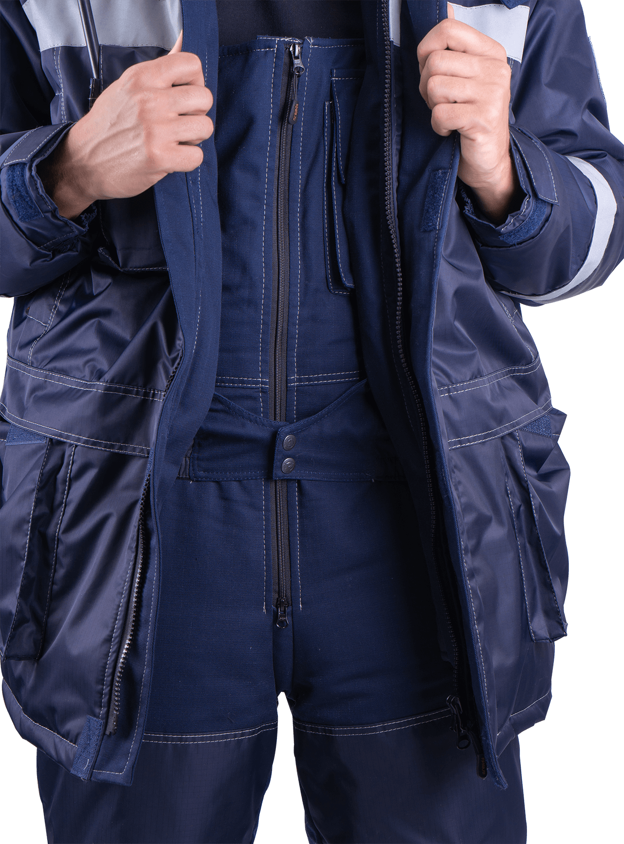 В костюме используется световозвращающая полоса (СВП) 50 мм.