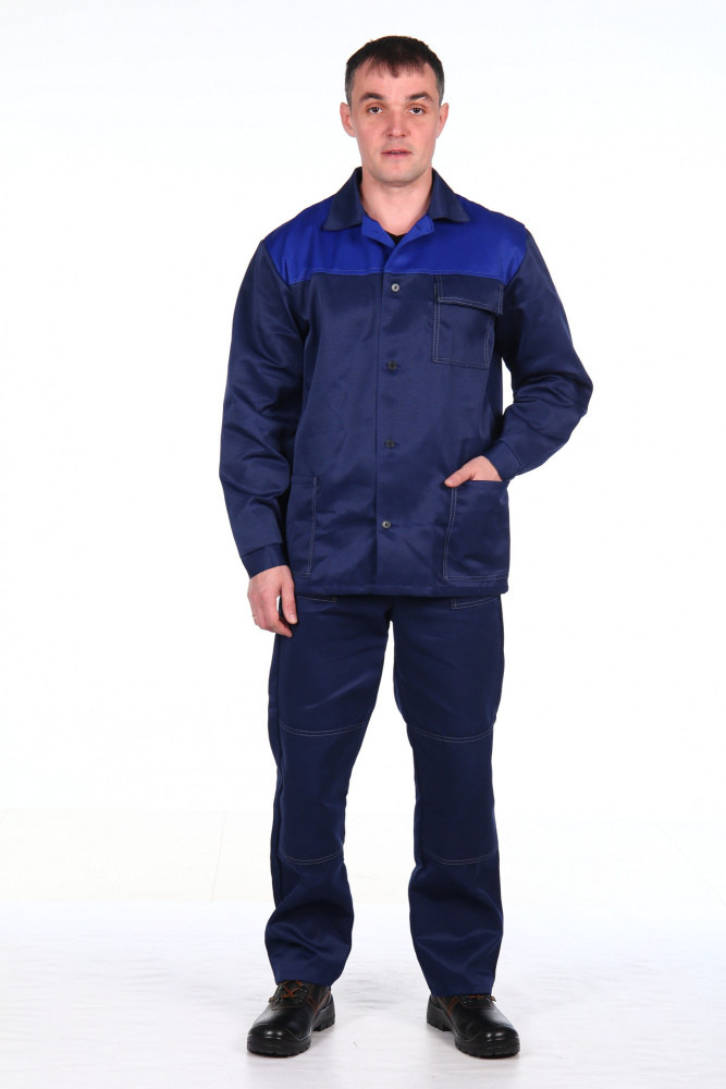 Куртка прямая с застежкой на пуговицы, с двумя карманами снизу и одним нагрудным на клапане. Полочки и спинка на кокетках контрастного цвета. Брюки прямые с накладными карманами по бокам, с притачным поясом. Костюм усилен накладками в районе локтей и колен.