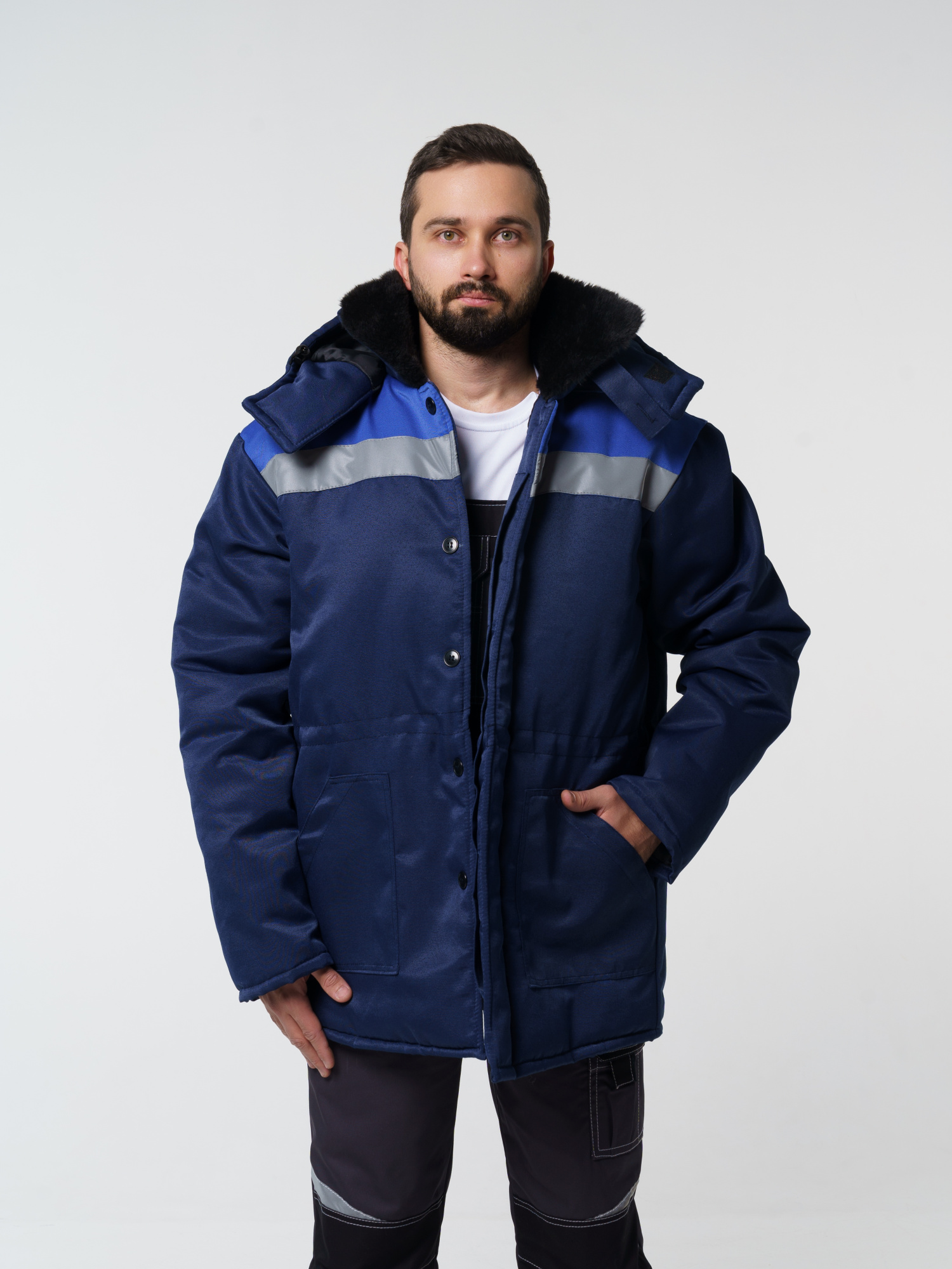Куртка прямого силуэта, с притачной утепленной подкладкой, с центральной потайной застежкой на пуговицы (верхняя петля сквозная), отложным меховым воротником, накладными  нижними карманами. По линии талии – кулиса  со шнуром.  По кокеткам куртки настрочены светоотражающие полосы шириной 50мм. Съемный капюшон.