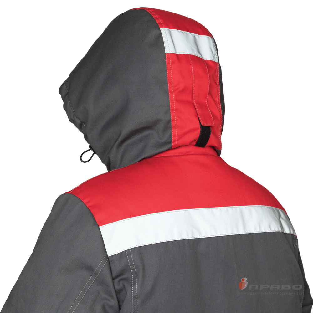 Капюшон: съёмный, с притачной утеплённой подкладкой, с застёжкой на ленту контактную. На центральной части настрочена СОП шириной 50мм и хлястик, с фиксацией на ленту контактную. По лицевому вырезу капюшона эластичный шнур, продетый в кулиску. Выходы для шнура в виде люверсов. Длина шнура регулируется с помощью фиксаторов. Капюшон пристёгивается к верхнему воротнику на застежку молнию, закрытую планкой.
