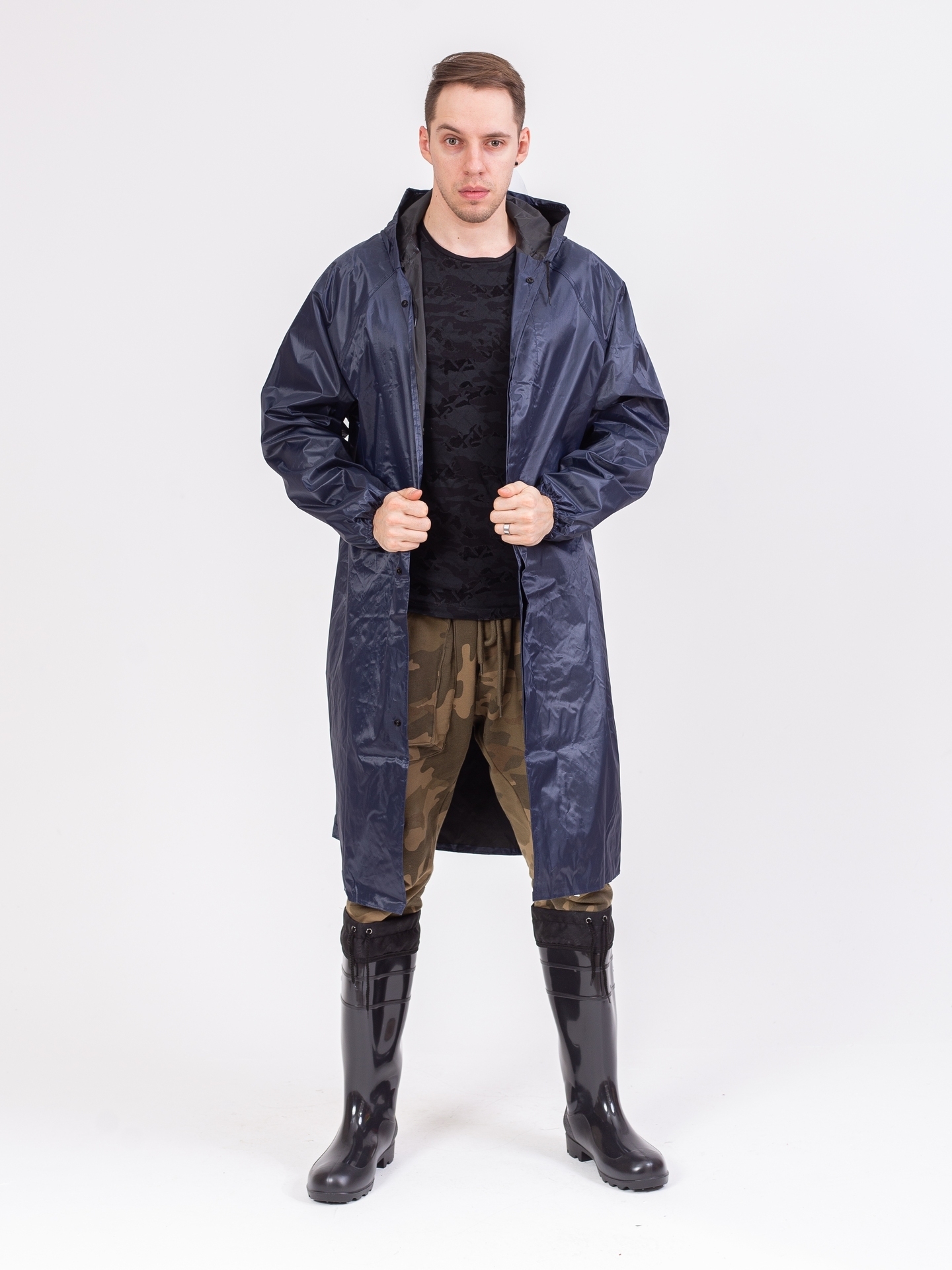 Плащ с застежкой на кнопках, отложной воротник, имеет капюшон, прошитые и герметично проклеенные швы, манжеты резинки на рукавах. Объем капюшона регулируется по лицевому вырезу шнуром с наконечниками.