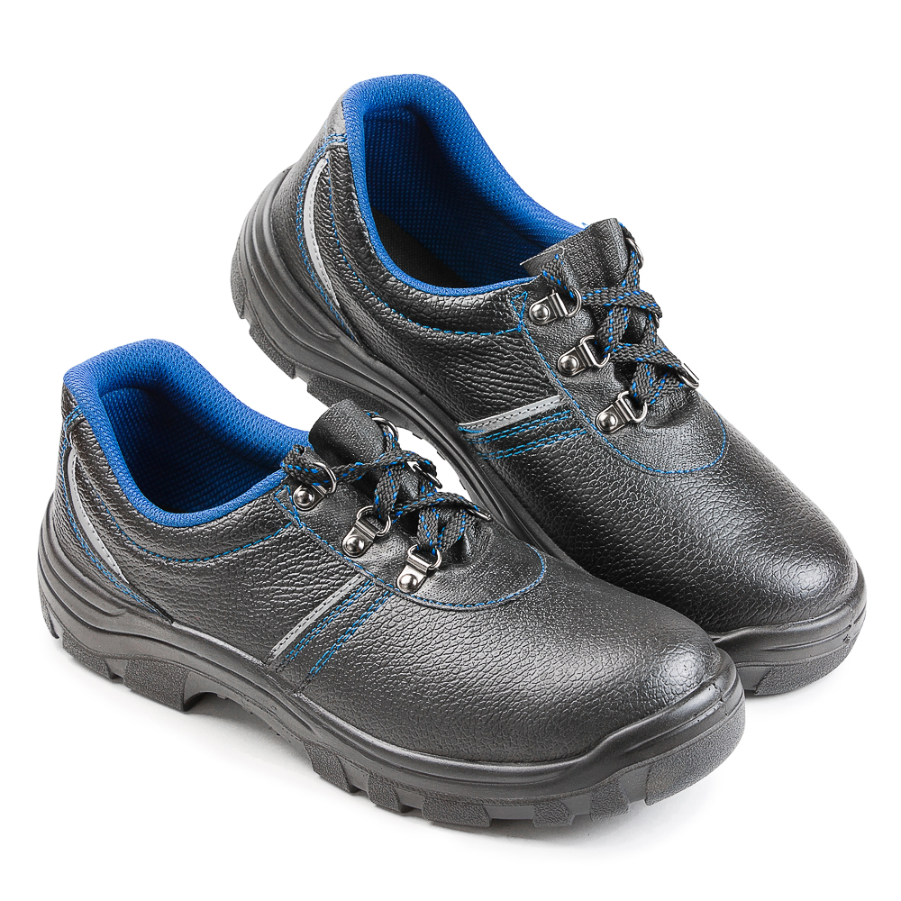 Полуботинки изготовлены методом литья подошвы к заготовке верха обуви. Имеется пристроченная прилитая задинка. Верх полуботинок из натуральной кожи. Подкладка полуботинок из текстильного материала, стойкого к истиранию и отводящего влагу от стопы. В верхней части полуботинок мягкий кант. Полуботинки завязываются на шнурки и имеют глухой клапан. Шнуровка с использованием металлических люверсов. Стелька вкладная. В носочной части внутренний защитный подносок из металла ударной прочностью 200 Дж. На боковинах фигурные световозвращающие элементы в виде полосок для лучшей видимости работника. Выполнена контрастная отстрочка синего цвета в тон цвета подкладки. Подошва однослойная, полиуретановая, маслобензостойкая (устойчива к воздействию агрессивной среды: нефть, масла, нефтепродукты, щелочи концентрацией до 20%, кислоты концентрацией до 20%). Есть внутренняя амортизирующая вставка в пяточной части подошвы. Глубина профиля ходового слоя подошвы составляет 3,5 мм. Цвет полуботинок черный.