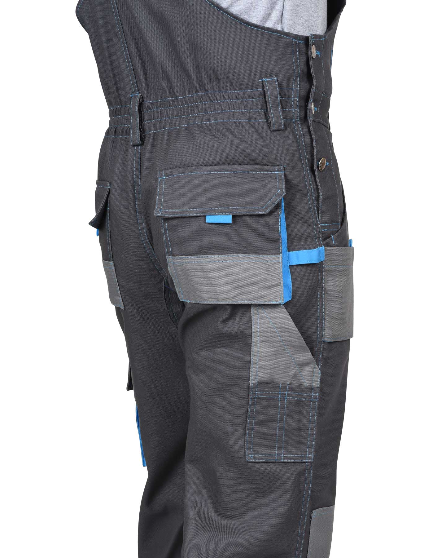 Полукомбинезон выполнен из ткани "Панакота Комфорт", с застежкой гульфика на молнию, застежкой в боковом шве на пуговицы, накладным объемным комбинированным карманом на нагруднике с фигурным клапаном, застегивающимся на липучку. Изделие с нижними боковыми накладными комбинированными объемными карманами с наклонным входом, с накладным объемным карманом и фигурным клапаном на правом боковом шве, застегивающимся на липучку, с объемными наколенниками, с задними накладными объемными карманами и комбинированным карманом для инструмента. В области талии по всей ширине с изнаночной стороны вставлена резинка для лучшего прилегания.