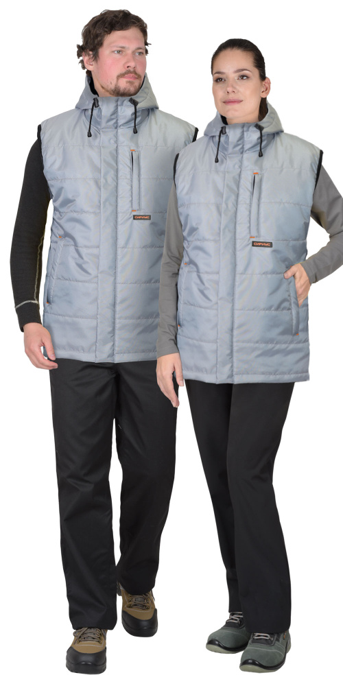 Жилет утеплённый, стёганный, на подкладке, с втачным капюшоном, с центральной застёжкой на молнию, закрытую ветрозащитным клапаном от края капюшона до низа изделия, застёгивающимся на кнопки. Жилет с одним нагрудным карманом с молнией и двумя нижними карманами. Спинка жилета, удлинённая с фигурной линией низа. Пройма окантована резинкой. Объём капюшона по лицевому вырезу регулируется шнуром с фиксаторами.
