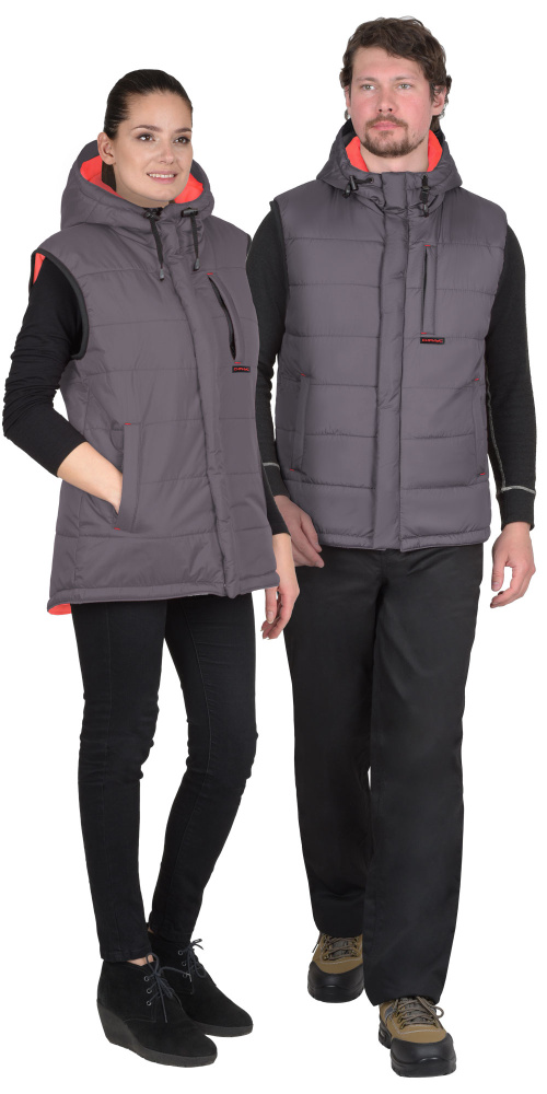 Жилет утеплённый, выстеган с утеплителем горизонтальными строчками, с подкладкой контрастного цвета, с втачным капюшоном, с застёжкой на молнию, закрытую ветрозащитным клапаном, застёгивающимся на кнопки. Жилет с одним нагрудным карманом с молнией и двумя нижними карманами. Спинка жилета, удлинённая с фигурной линией низа. Пройма окантована резинкой. Объём капюшона по лицевому вырезу регулируется шнуром с фиксаторами.